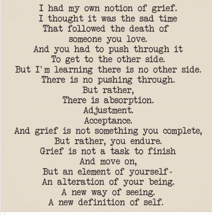 And grief is not something you complete, But rather, you endure. Grief is not a task to finish And move on, But an element of yourself- An alteration of your being.