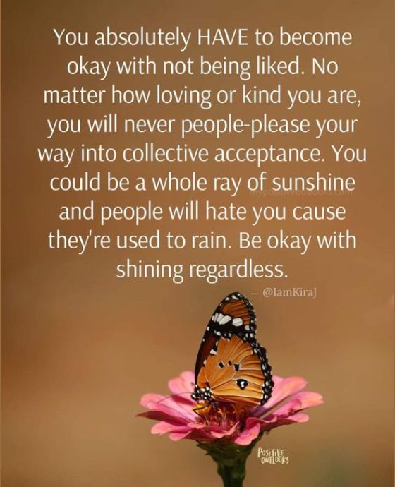 You absolutely HAVE to become okay with not being liked. No matter how loving or kind you are, you will never people-please your way into collective acceptance. You could be a whole ray of sunshine and people will hate you cause they're used to rain. Be okay with shining regardless. -@@IamKiraJ