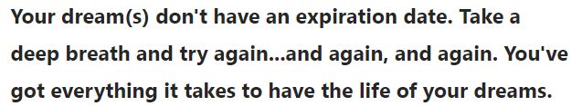 Your dream doesn't have an expiration date. Take a deep breath and try again... and again, an again. You've got everything it takes to have the life of your dreams.