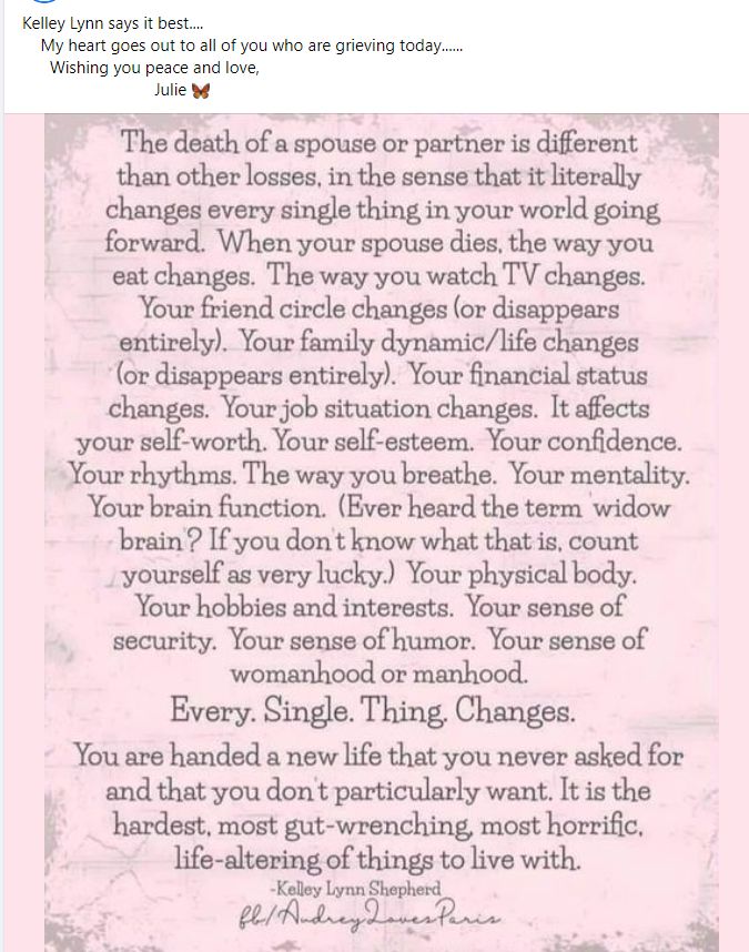 The death of a spouse or partner is different than other losses, in the sense that it literally changes every single thing in your world going forward.